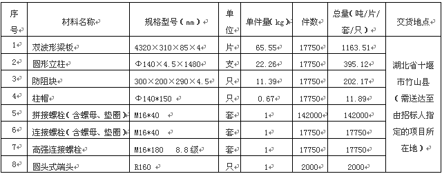二、本次招标范围为竹山县国省道公路波形梁护栏采购,共一个合同段,招标清单如下: