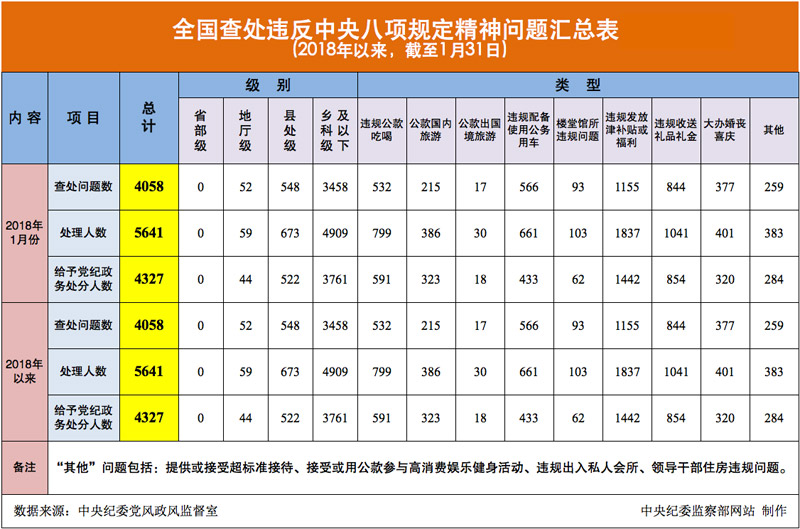 人民网北京2月22日电 中央纪委监察部网站22日发布消息,2018年以来,截至1月31日,全国查处违反中央八项规定精神问题4058起,处理5641人,其中包括59名地厅级干部、673名县处级干部。