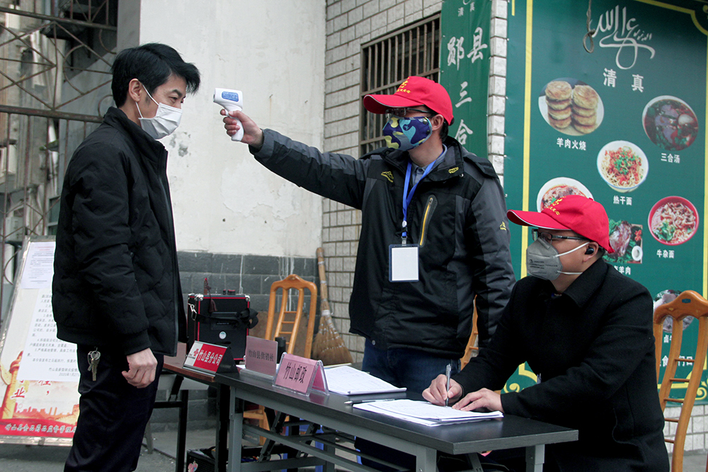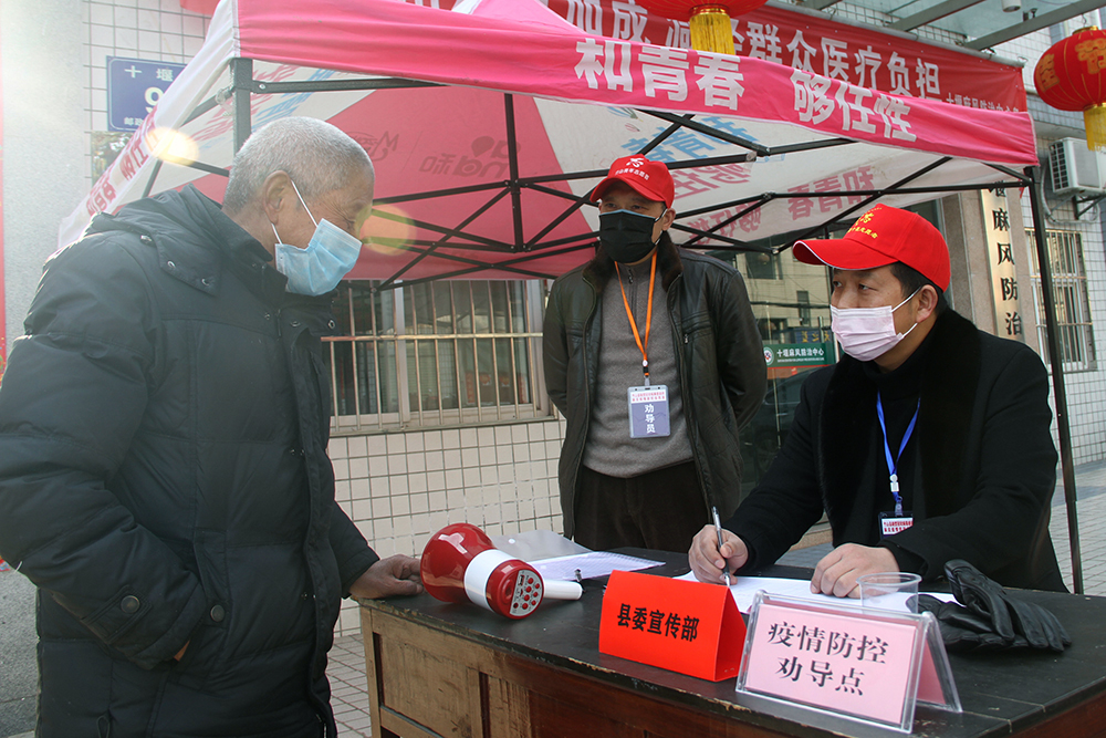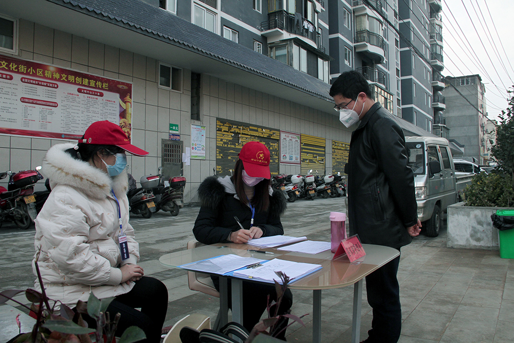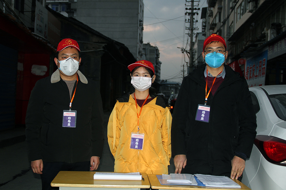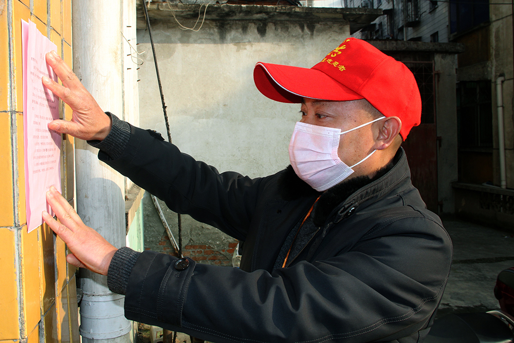 2月5日的县城街道上,行人车辆稀少,戴着小红帽的志愿者们格外耀眼。他们分布在各小区门口、重要交通路口、超市门口、公园广场里宣传疫情防控知识、劝导外出群众返回做好居家隔离。(王俊)