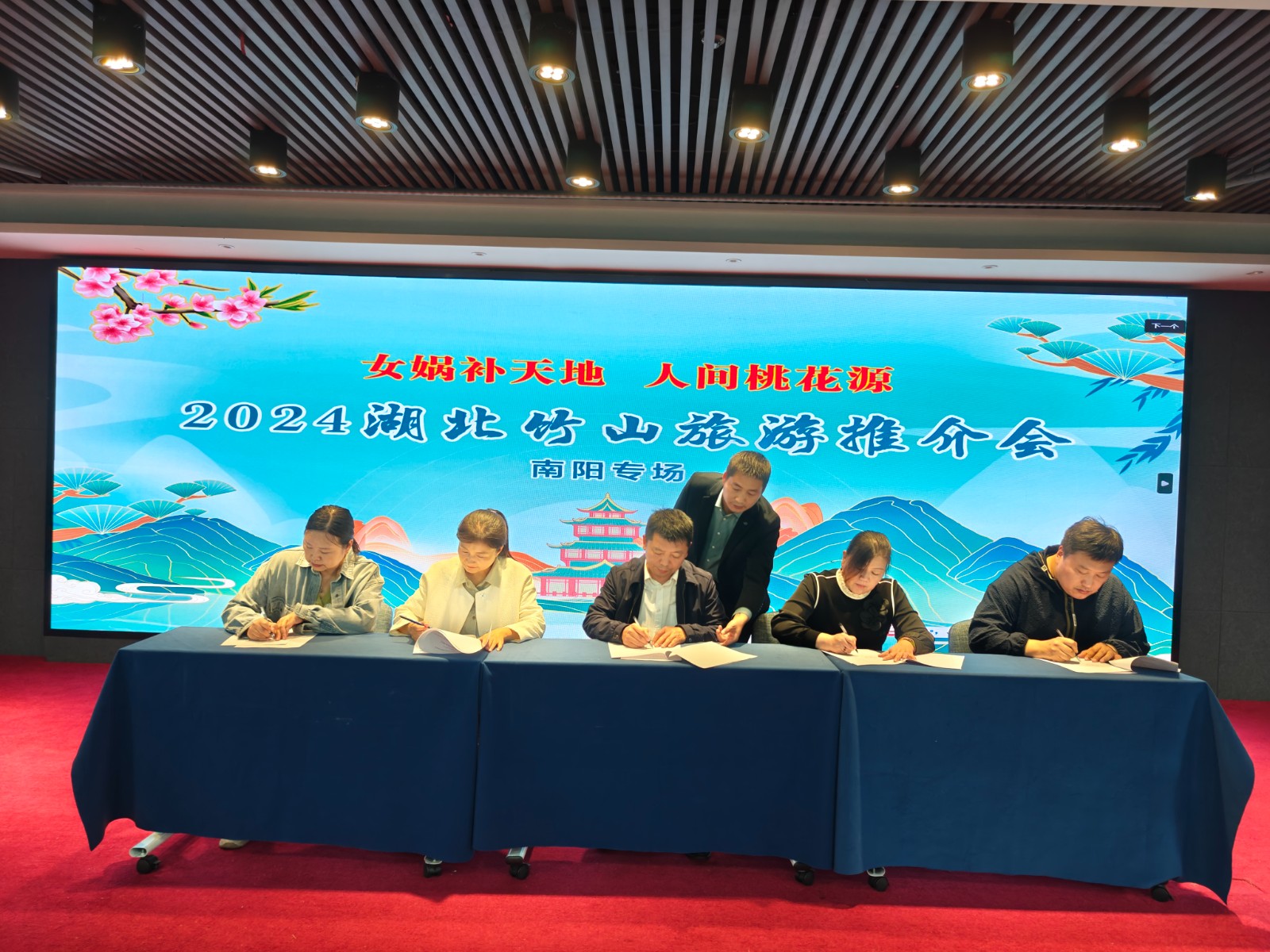 县旅游产业服务中心为襄阳市、南阳市的旅行社和游客们解读《竹山县“引客入竹”旅游奖补办法》;文旅推介官代表竹山作旅游推介,介绍竹山特色景区和精品旅游线路;并带来舞蹈表演《竹韵茶香》,竹山县太和梅花谷旅游区、上庸文化旅游区、擂鼓西河分别介绍各自景区特色。通过精美的视频展示和生动的讲解,向与会嘉宾详细介绍了竹山县的自然风光、人文历史、民俗风情以及各类特色旅游产品和线路。推介会上,襄阳市、南阳市旅行社协会负责人分别代表襄阳、南阳旅行社发言;竹山红途旅行社与湖北襄阳、河南南阳旅行社代表签订合作协议,共同推广竹山旅游产品。