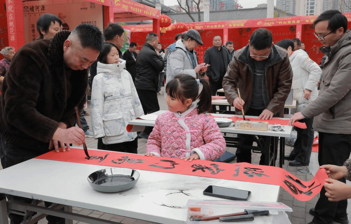 此外,县书法家协会成员们还挥毫泼墨书写福字和春联,赠送给前来办年货的市民们,让大家在收获物质年货的同时,也收获了一份新春祝福,让火热的年货大集更添一份浓浓的文化气息。