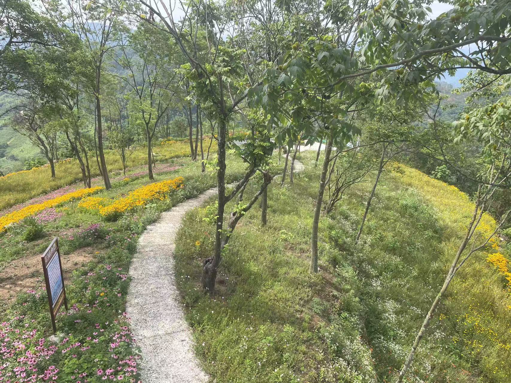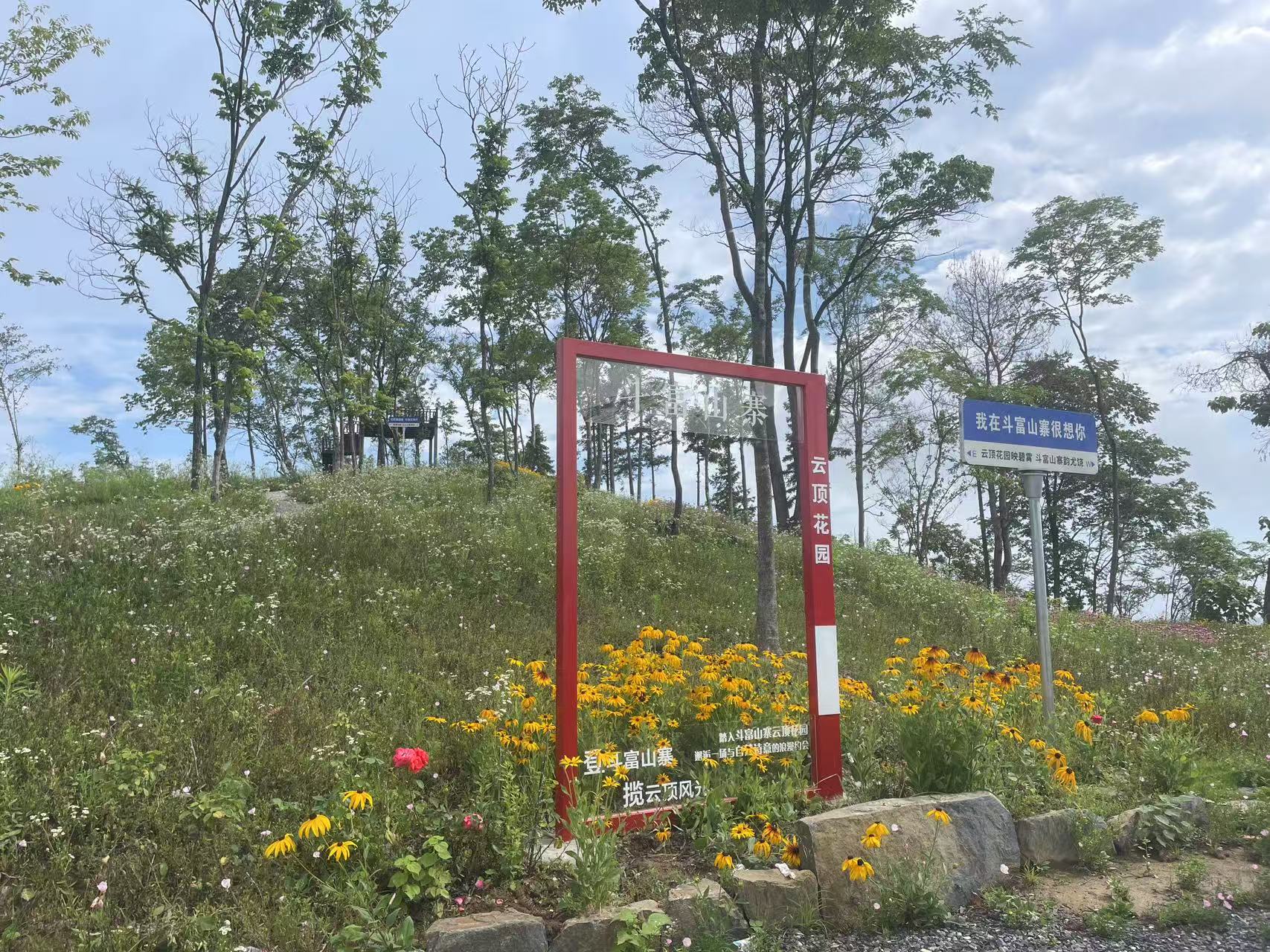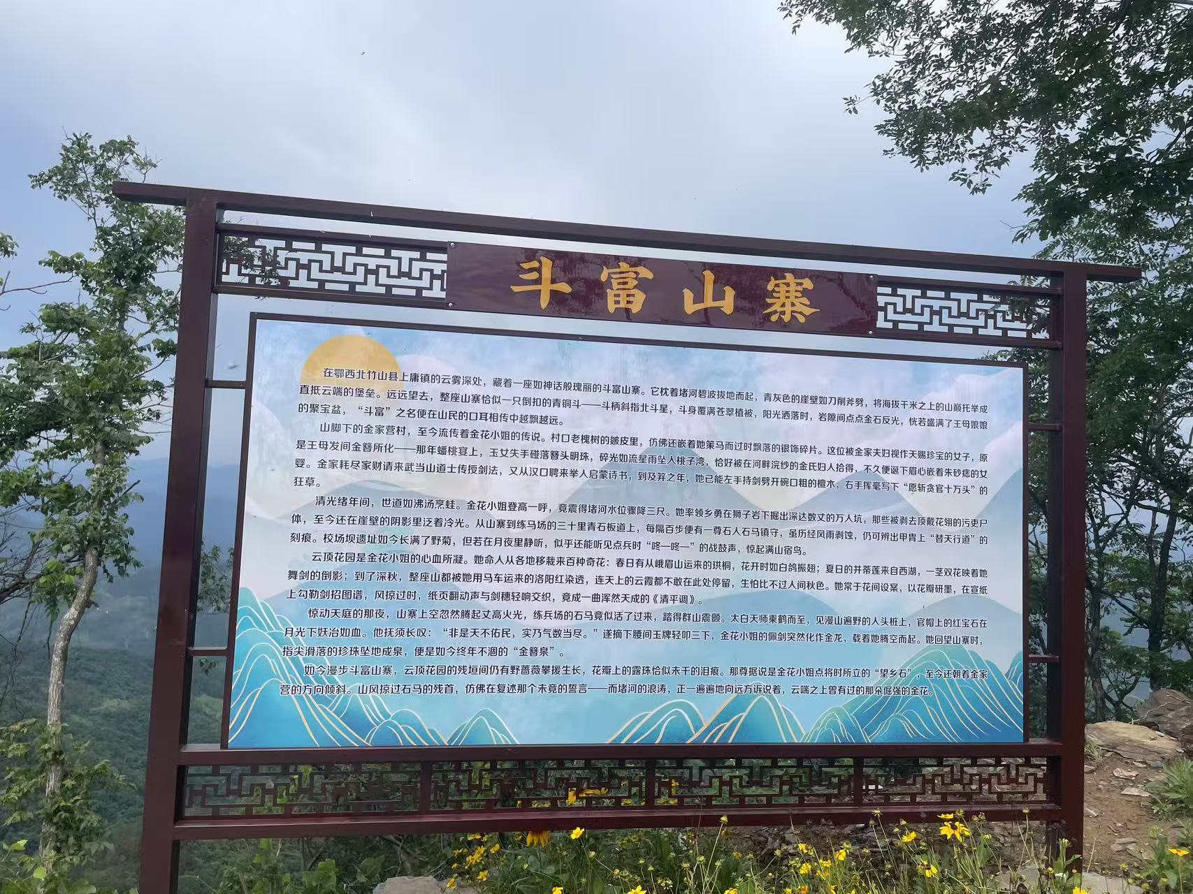 沿着登山步道攀登斗富山,沿途风景绝美,指示路标创意满满。临近山顶,视野逐渐开阔起来,映入眼帘的是一片片花海,五颜六色的鲜花竞相开放,蝴蝶在其中追逐嬉闹,好不热闹。古老的林木与藤蔓相互缠绕,各自舒展着优雅的身姿。林间小道干净整洁,走在上面舒适悠闲。清晨,可以攀登至山顶感受日出时的光芒万丈;傍晚,可以体验夕阳西下的静谧美好。登上山顶瞭望台,向南可近观官渡驴头山,向西可远眺宝丰女娲山,堵河蜿蜒向前的美好景象也尽收眼底。快来感受斗富山的无穷魅力吧。(张成焕)