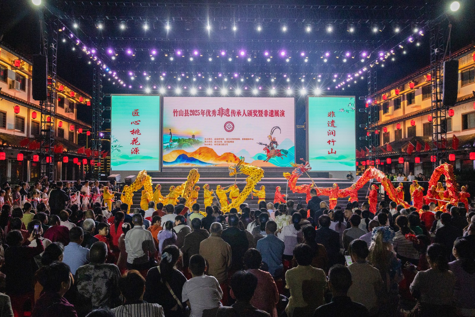 今日竹山网消息 非遗润竹山,匠心桃花源。10月7日晚,桃花源街区女娲广场灯火通明,2025年优秀非遗传承人颁奖暨展演活动在此举行,3000余名游客与市民驻足观赏,沉浸式感受传统技艺的文化魅力。这场“静态展示 动态表演”的文化盛宴,正是当地以非遗激活文旅产业融合发展的生动缩影。