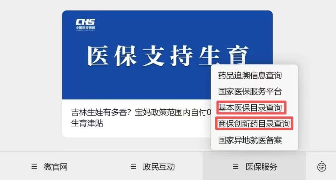 答:第一步:进入“国家医保局”微信公众号,点击菜单栏“微服务”→选择“国家医保药品目录查询”或“商保创新药目录查询”,进入相应查询页面。