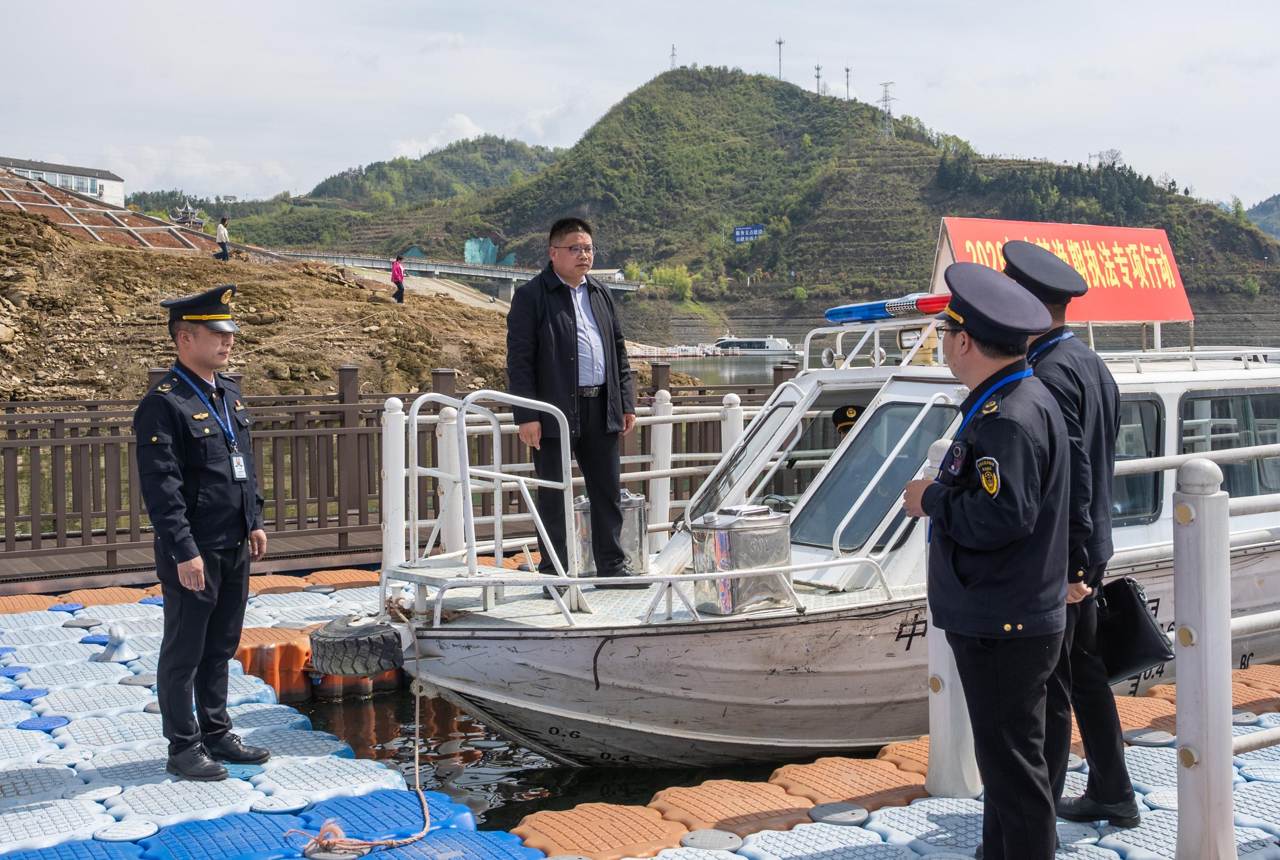 今日竹山网消息 为深入贯彻落实长江流域禁捕工作部署,严厉打击非法捕捞行为,筑牢水域生态安全防线,3月31日,竹山县交通运输综合执法大队联合上庸镇政府、公安派出所、农业综合执法大队等多部门,在潘口、松树岭、龙背湾等库区水域开展长江流域禁捕水域非法捕捞问题隐患专项排查整治行动,此次行动共出动执法车辆3台、执法艇1艘、执法快艇2艘,执法人员10余人。