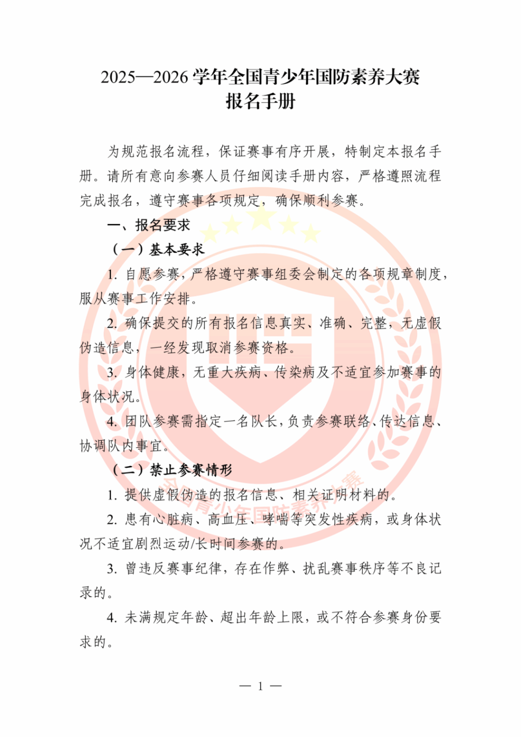 2025—2026学年全国青少年国防素养大赛报名系统已正式上线,即日起开放,热烈欢迎广大青少年朋友报名参与,具体操作流程详见报名手册。相关事项说明如下: