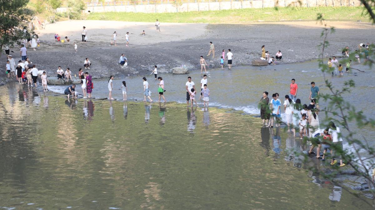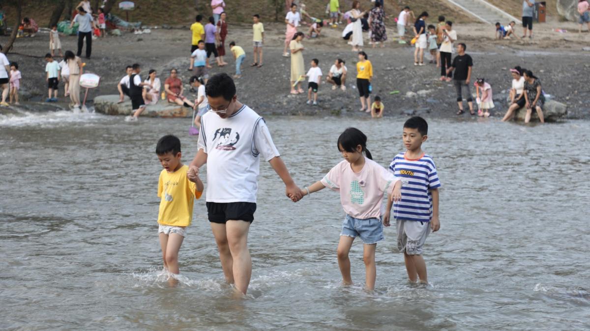 傍晚时分,市民们三五成群,或悠闲散步,或涉水嬉戏,尽情享受这份家门口的清凉。值得一提的是,这处桃花潭水瀑布倾泻而下,凉意习习,成为热门的拍照打卡地,游人络绎不绝。