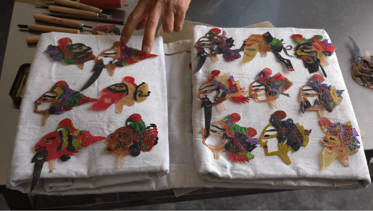 除了选材,制作皮影人更是个复杂奇妙的过程。梁荣山介绍,做好一个皮影人,要经过选皮、制皮、画稿、过稿、镂刻、敷彩、发汗熨平、缀结合成等多道工序。