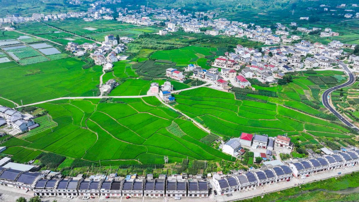 7月13日,在笔者的航拍镜头下,麻家渡镇柿树坪村的连片稻田如同绿色的绒毯铺展在大地上,田埂间,纵横交错的道路将村庄与田野相连,白墙黛瓦的农舍点缀其间,在阳光的照耀下显得格外静谧祥和。(章 伟 摄)