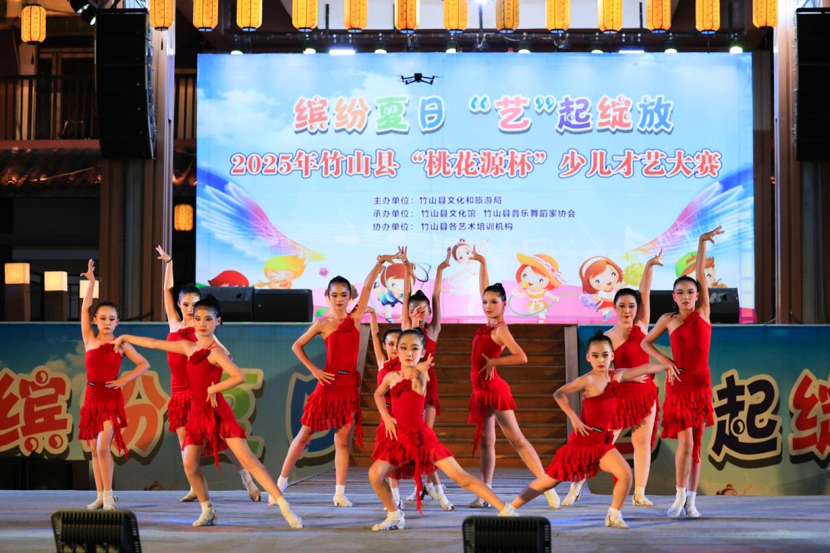 本报讯 7月30日晚,竹山县“桃花源杯”少儿才艺大赛(群舞组)在陶然广场上演。大赛持续约20天,含声乐、舞蹈等六类,近千名5-16岁少年儿童参与。