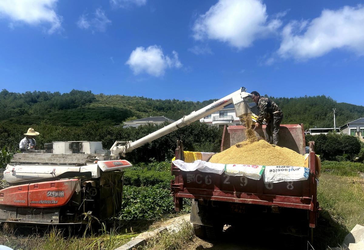 稻穗入机,割稻、脱粒、碎秆一气呵成,转瞬间,稻谷从送粮口簌簌倾泻,堆起黄澄澄的谷堆,晕染出擂鼓镇秋日限定“丰”景。(冯键烽)