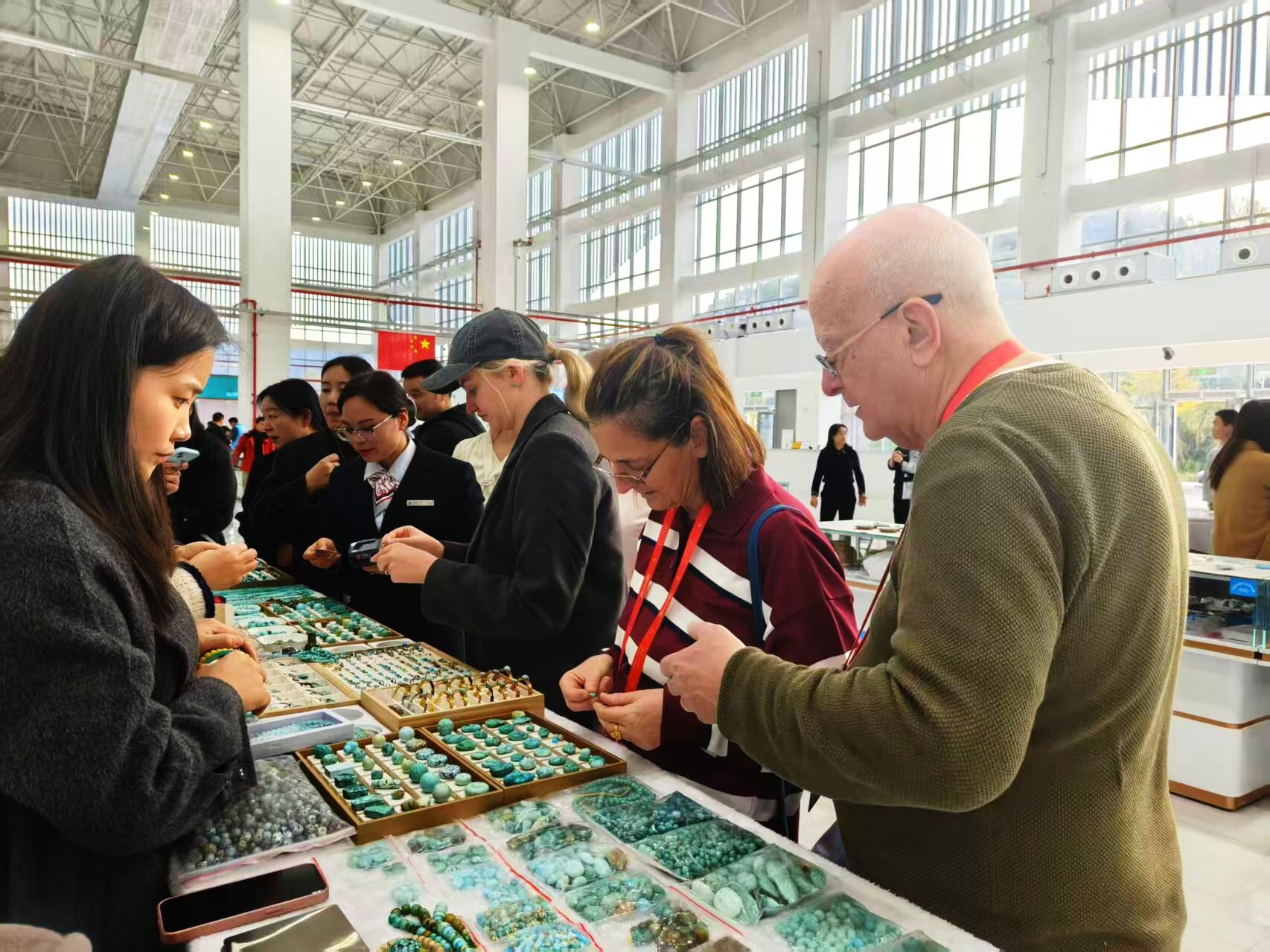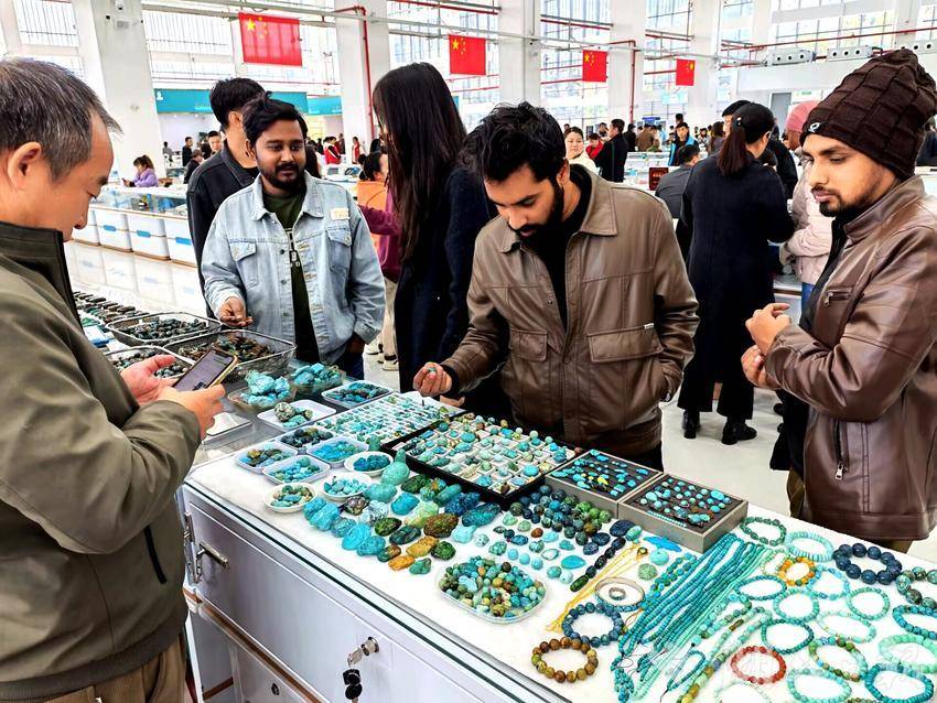 “有朋自远方来,不亦乐乎。”活动期间,竹山国际珠宝交易中心犹如一颗耀眼的星辰,吸引着来自五湖四海的游客。他们漫步其中,仿佛踏入了一个绿松石的梦幻王国,感受着这份来自大自然的馈赠。麻家渡,这座被誉为“世界绿松石之都”的地方,以满腔的热情迎接着每一位远道而来的宾客。交易中心内,占地1.1万平方米的精品展厅熠熠生辉,600余家商户的展位前热闹非凡,游客们或驻足欣赏,或细细挑选,不时与商户交流,脸上洋溢着满足与喜悦。