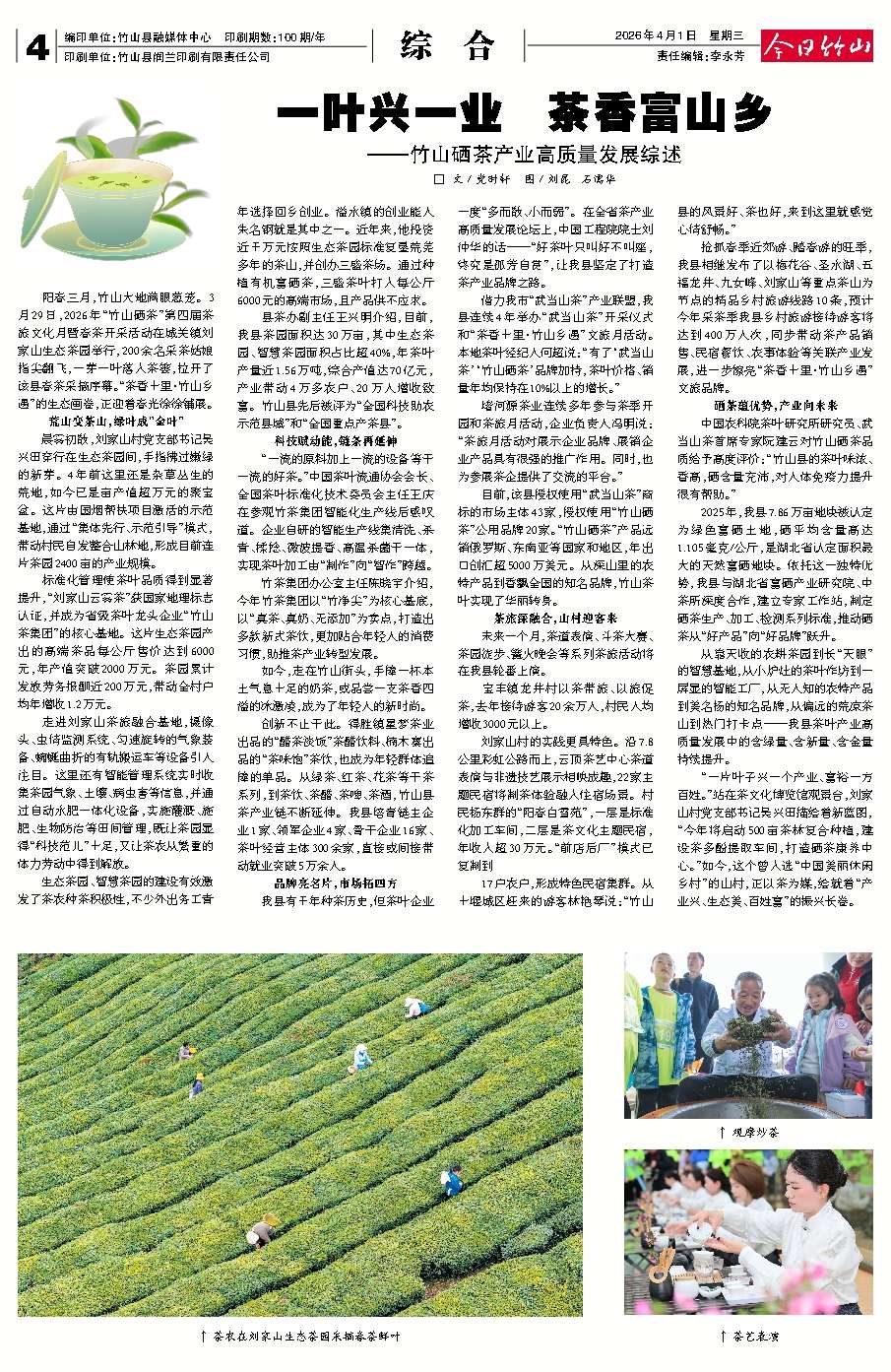 县茶办副主任王兴明介绍,目前,我县茶园面积达30万亩,其中生态茶园、智慧茶园面积占比超40%,年茶叶产量近1.56万吨,综合产值达70亿元,产业带动4万多农户、20万人增收致富。竹山县先后被评为“全国科技助农示范县域”和“全国重点产茶县”。